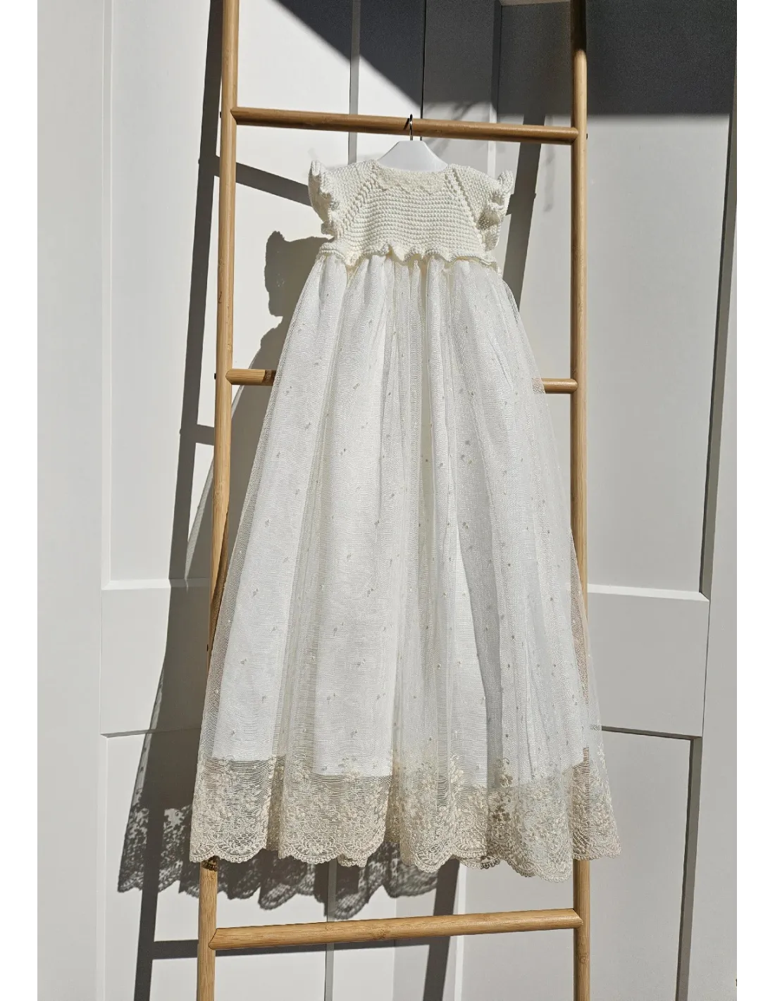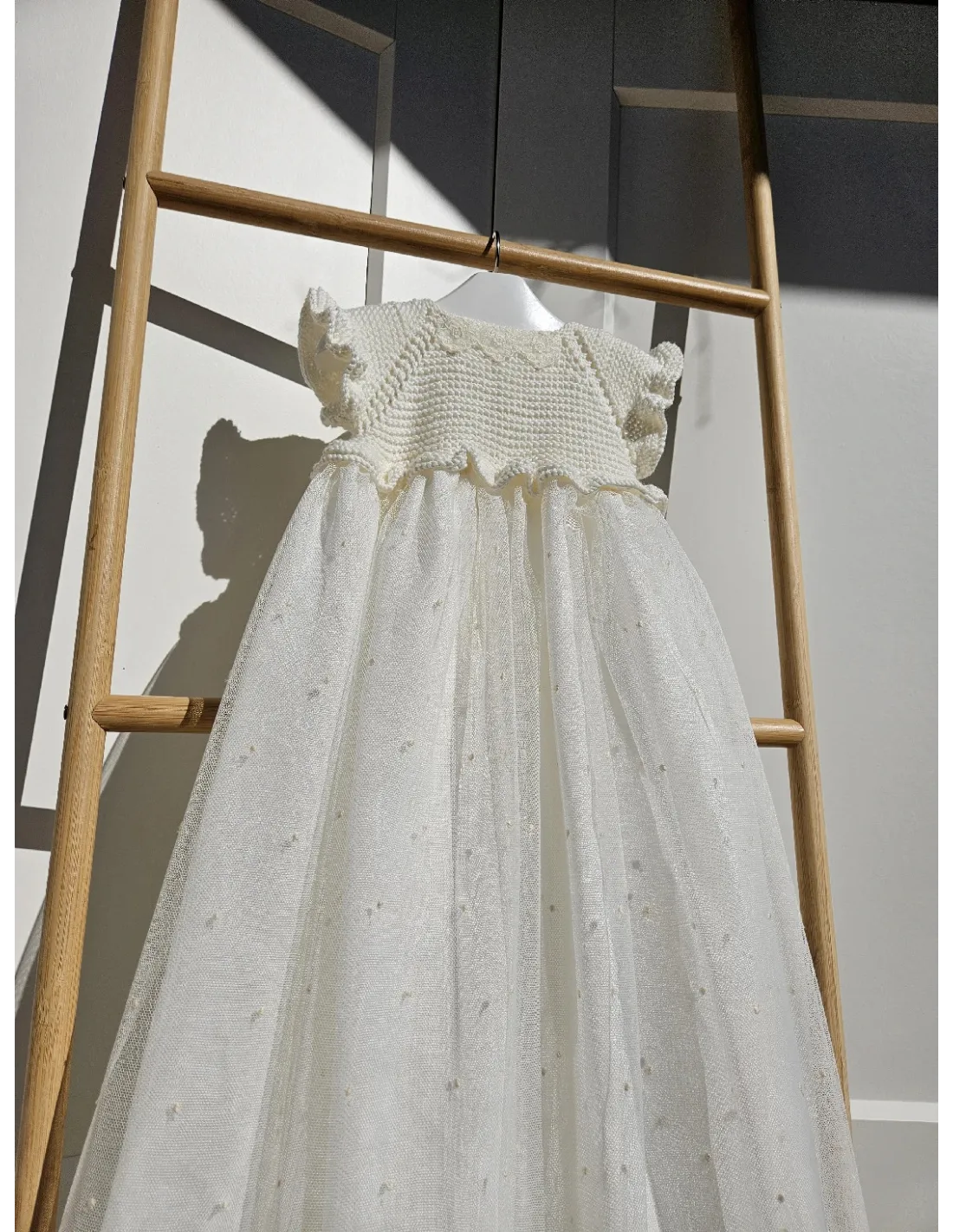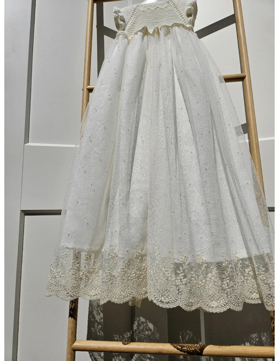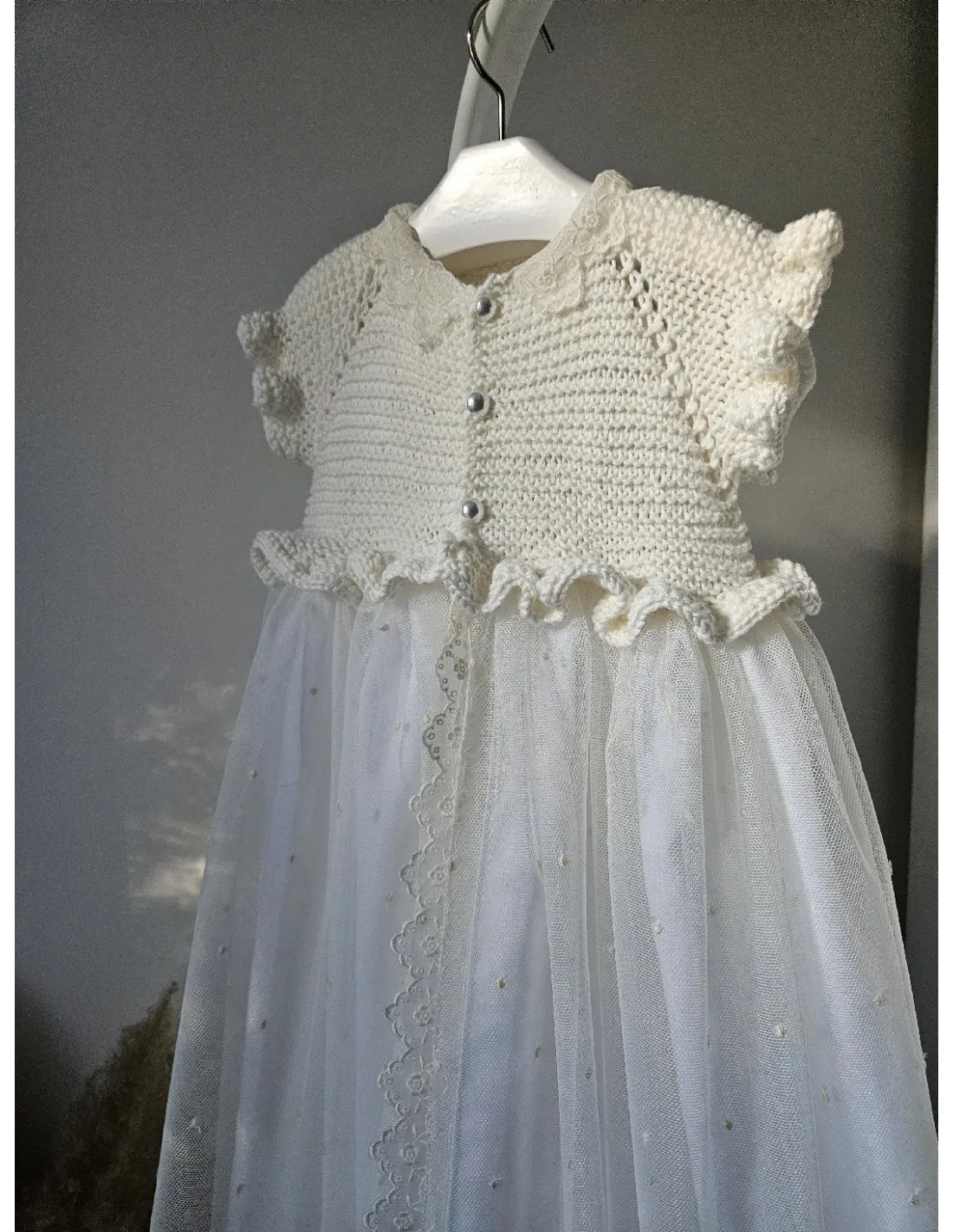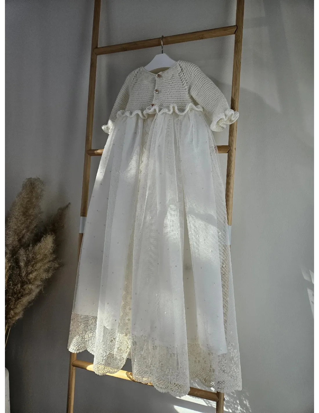 Cuerpo de punto en algodón tejido a mano y falda confeccionada en un espectacular tul bordado en plumeti con cenefa floral en el bajo. Enagua interior en lino natural marfil con puntilla de tul bordada. Los detalles de puntilla de encaje y la falda amplia aportan ligereza y movimiento, mientras que el cierre trasero facilita el vestido del bebé. Incluye braguita de lino. Cada faldón nace de un diseño, pero se convierte en único con tus preferencias. Tras la compra, contactaremos contigo personalmente para concretar cada detalle y crear una pieza única para tu bebé. El tiempo de entrega es de 45 días aprox.*