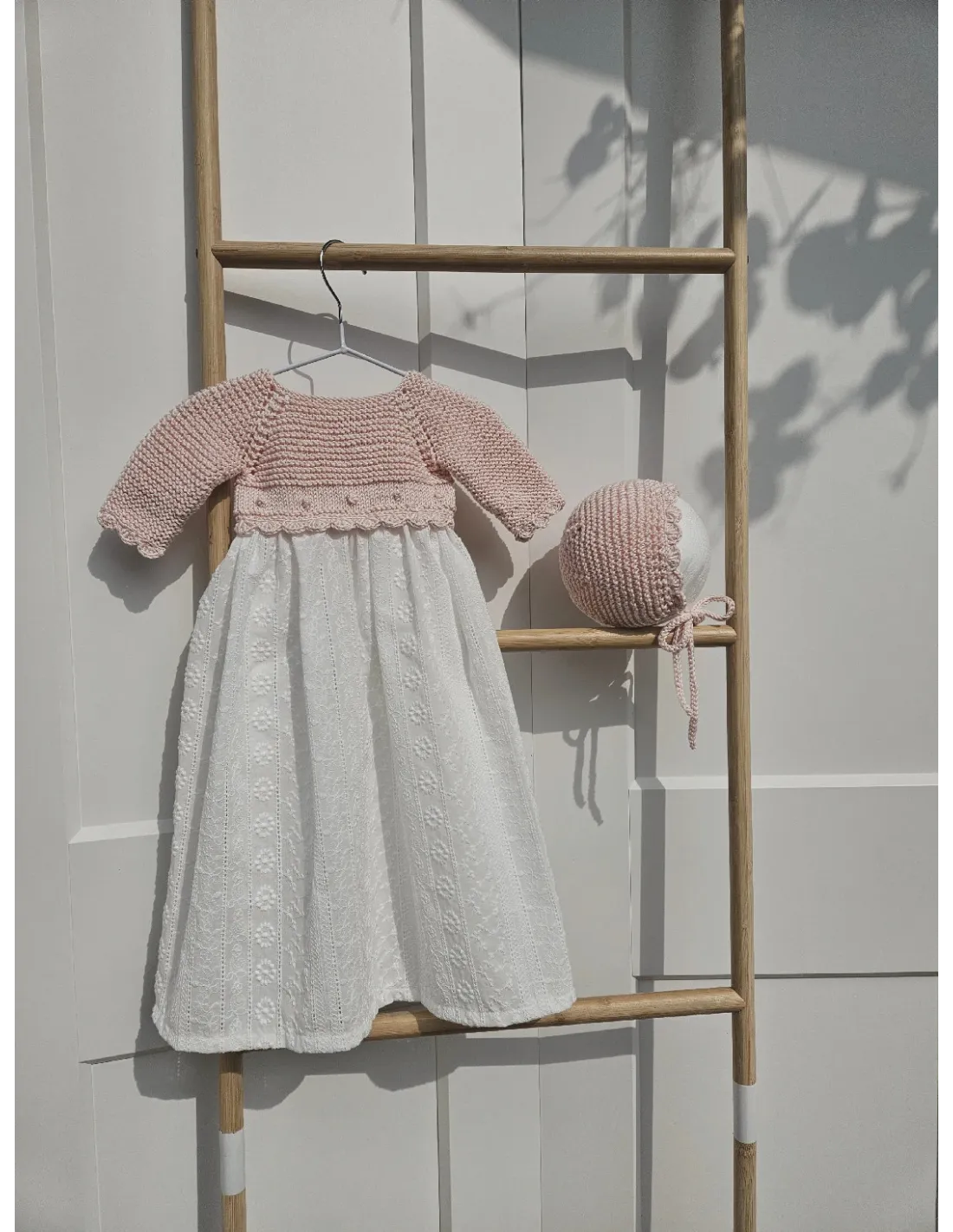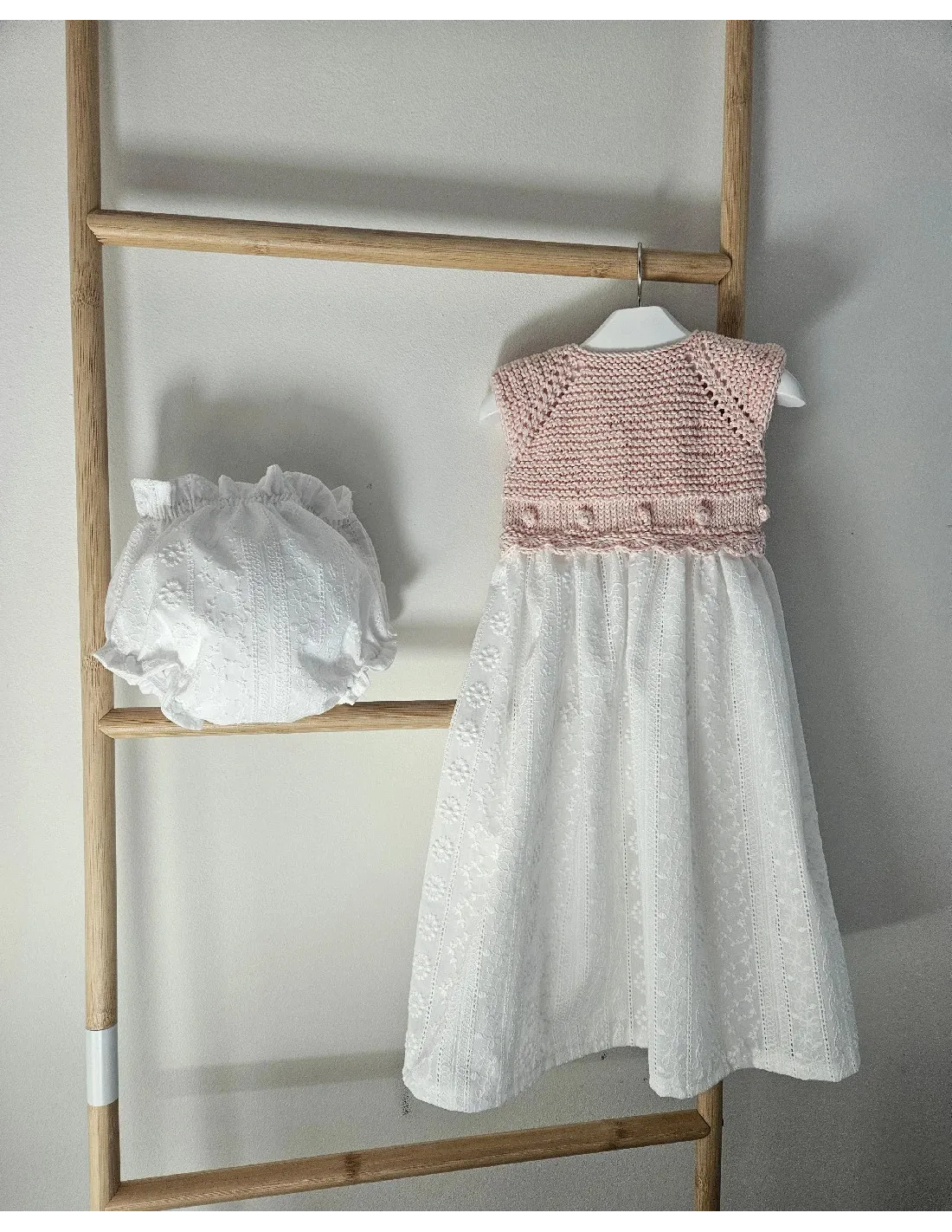 Vestido tejido a mano para las primeras veces, con falda disponible en plumeti blanco o batista blanca bordada. Perfecto para estrenar y crear recuerdos imborrables. Incluye braguita a juego confeccionada en la misma tela, capota y patucos. Con un diseño cómodo y elegante, ideal para momentos especiales desde el primer día. El tiempo de entrega es de 60 días aprox.*
