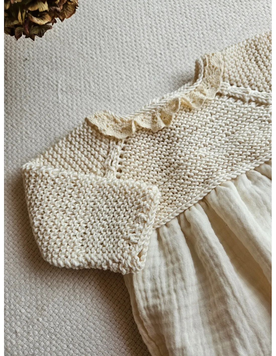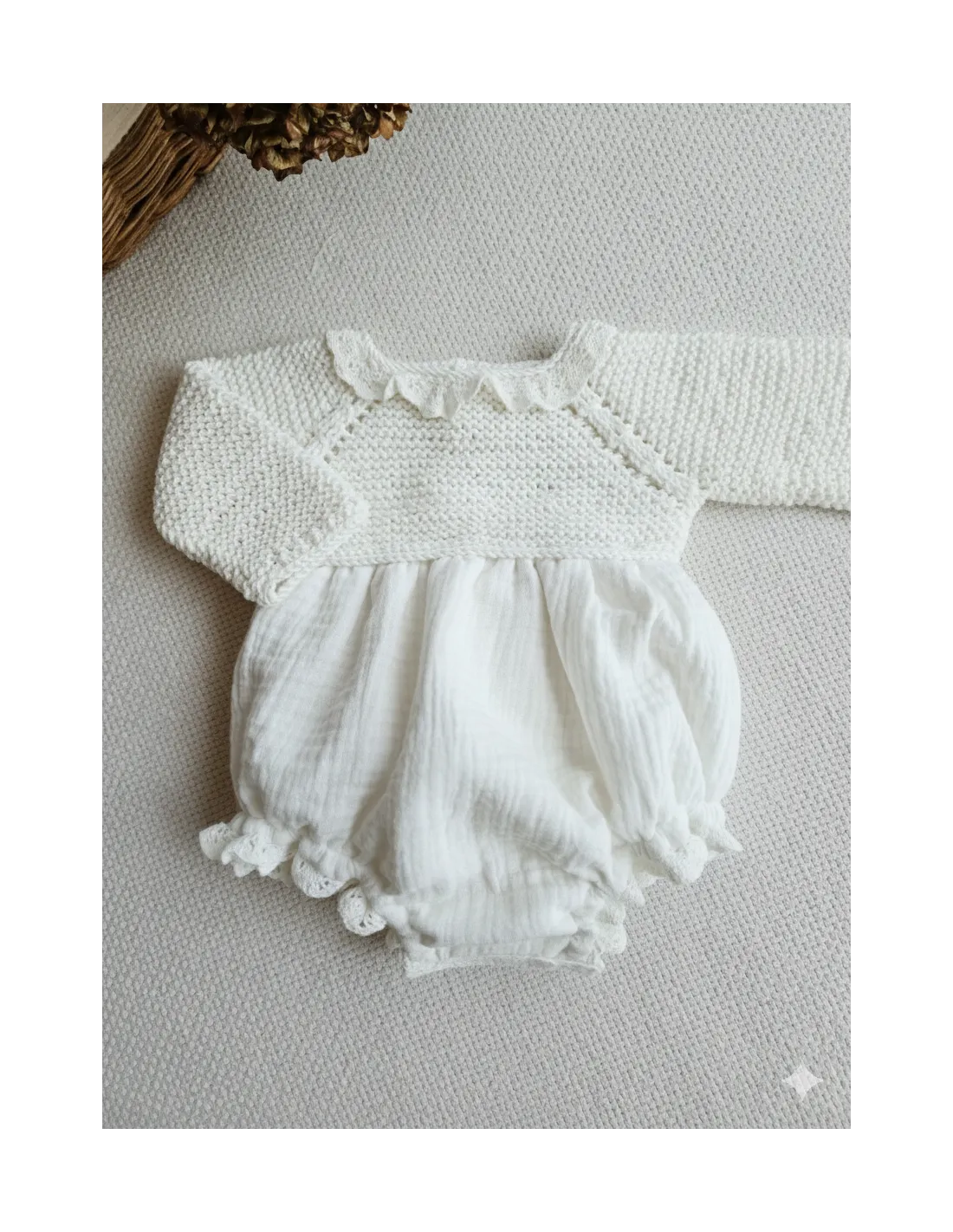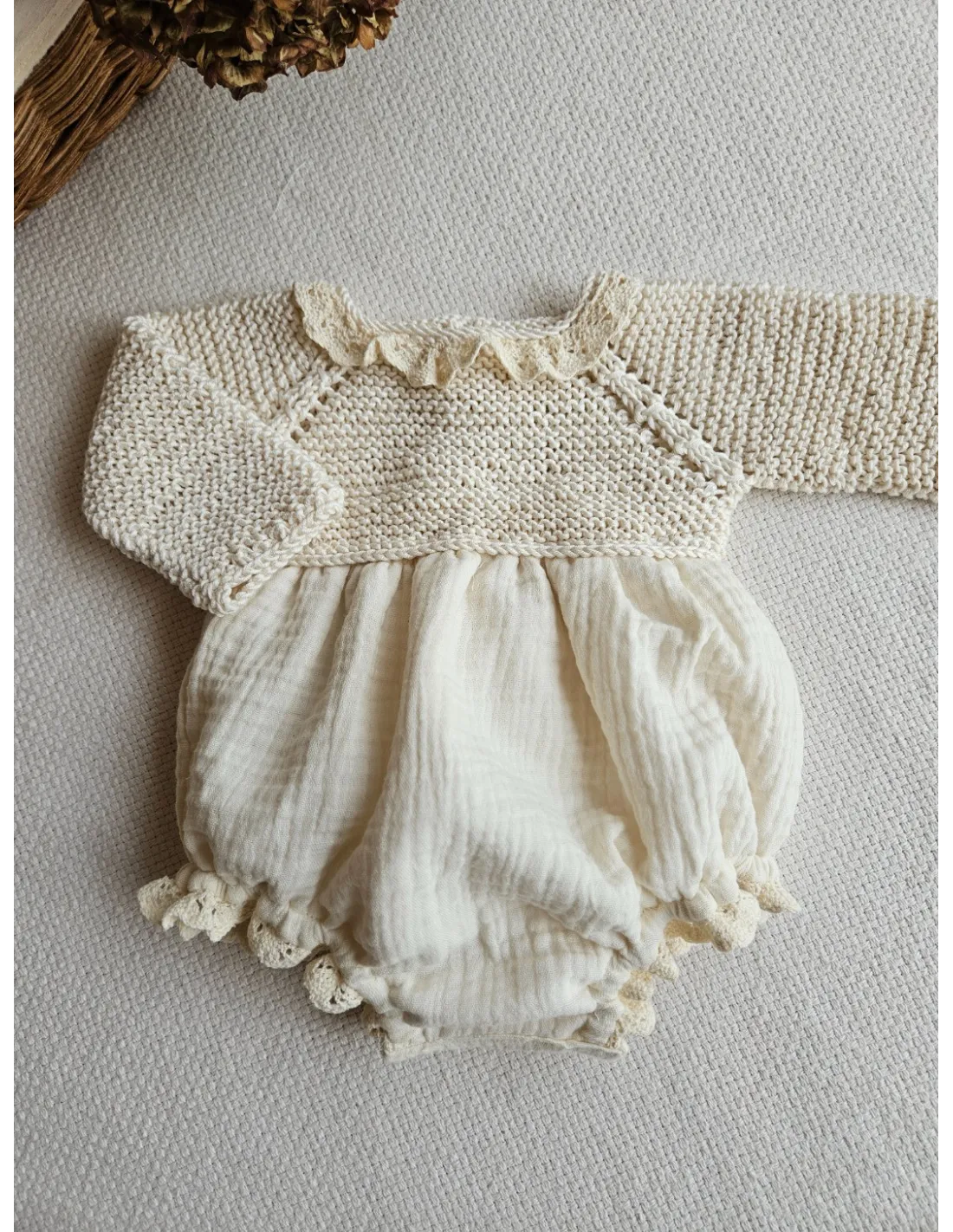 La unión de los tejidos más dulces para tu bebé. Cuerpo de punto hecho a mano en beige, combinado con bambula marfil con su forro de algodón orgánico y detalles de puntillas en cuello y piernas. Confección y envío en 60 días aprox.